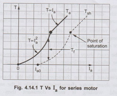 As the entire Ia passes through the series field, there is a property of an electromagnet called saturation, may occur. Saturation means though the current through the winding increases, the flux produced remains constant. Hence after saturation the characteristics take the shape of straight line as flux becomes constant, as shown. The difference between Ta and Tsh is loss torque Tf which is also shown in the Fig. 4.14.1.