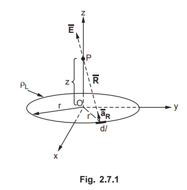 1. Obtain an expression for an electric field due to charged circular ring of radius 'h' placed in xy plane, at a point P (0, 0, z), having uniform line charge density of ρL C/m.
