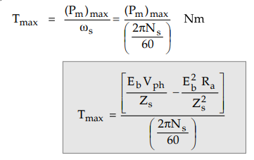 torque is given by P/ hence the maximum torque developed by a synchronous motor