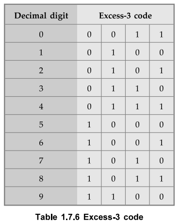 • Table 1.7.9 shows some 5-bit BCD codes having special characteristics. These special characteristics of the code are useful for error detection. As shown in the Table 1.7.9, 63210 and two-out-of-five codes have two 1s in every code group. The 63210 code is a weighted code (except for decimal digit 0) and it is used for storing data on magnetic tape. On the other hand two-out-of-five code is unweighted code and is used in the telephone and communications industries. Shift counter code, also known as Johnson code, and 51111 code has specific sequences of 1s which are useful for error detection.