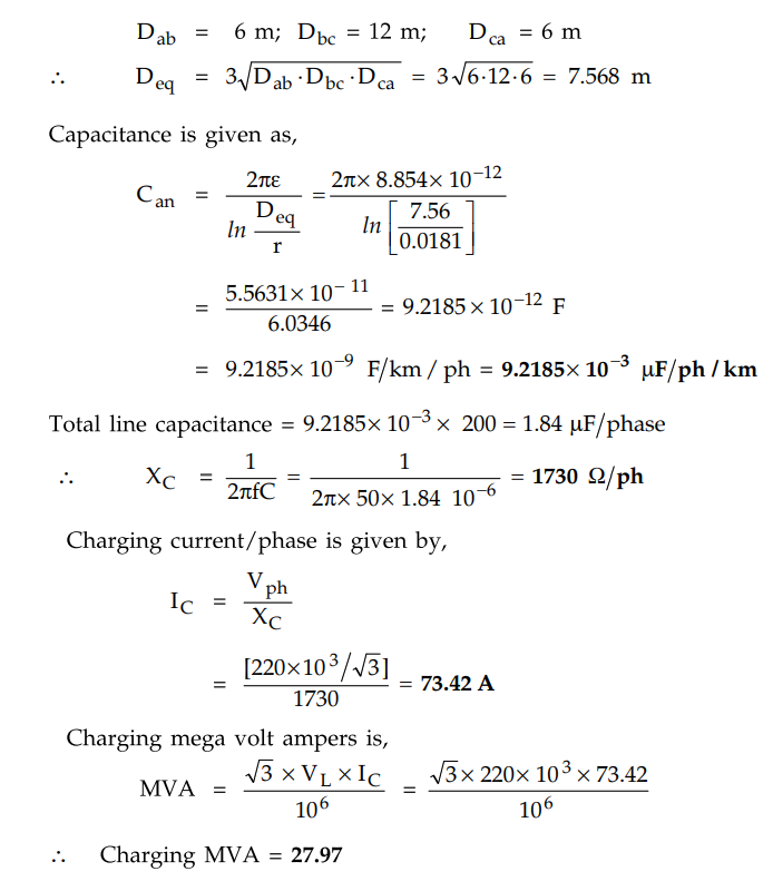 cm. Find the capacitance per phase per km, capacitive reactance per phase,