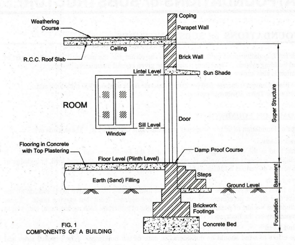 A building structure consists of Foundation or Substructure, Basement and Superstructure. Fig. 1 shows the different components of a single storey building with R.C.C. flat roof.