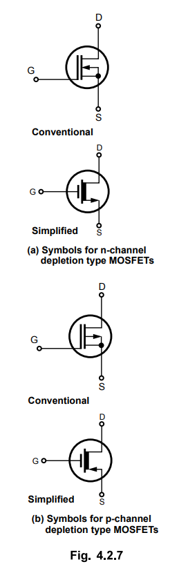 Fig. 4.2.7 shows graphic symbols for a n and p-channel depletion type MOSFET.