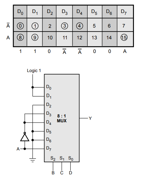 Implement the following boolean function using 8:1 MUX : F(A,B,C,D) = ∑m(0,1,3,4,8,9,15)