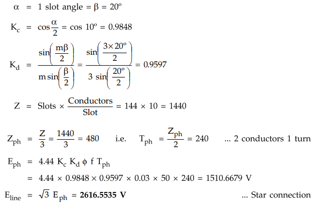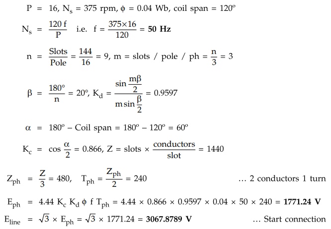 has 144 slots having 10 conductors in each slot. The flux per pole is 30 mWb