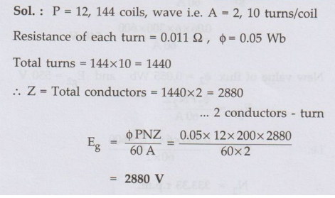 Ex. 3.6.4 A 12 pole D.C. generator has simple wave wound armature containing 144 coils of 10 turns each. The resistance of each turn is 0.011 Q. Its flux per pole is 0.05 Wb and it is running at a speed of 200 r.p.m. Obtain the induced armature voltage and the effective armature resistance.