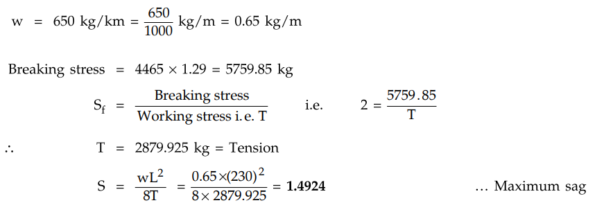 pressure of 1.5 kg/m length, calculate the sag if factor of safety is 5. Also