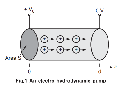 Q.16 a) Current carrying components in high-voltage power equipment must be cooled to carry away the heat caused by ohmic losses. A means of pumping is based on the force transmitted to the cooling fluid by charges in an electric field. The electro hydrodynamic (EHD) pumping is modelled in Fig. 1.