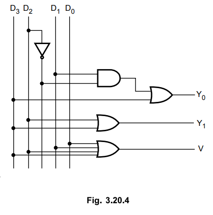 • Table 3.20.2 shows Dg input with highest priority and DQ input with lowest priority. When D3 input is high, regardless of other inputs output is 11. The D2 has the next priority. Thus, when D3 = 0 and D2 = 1, regardless of other two lower priority input, output is 10. The output for D1 is generated only if higher priority inputs are 0, and so on. The output V (a valid output indicator) indicates, one or more of the inputs are equal to 1. If all inputs are 0, V is equal to 0, and the other two outputs (Yj and YQ) of the circuit are not used.