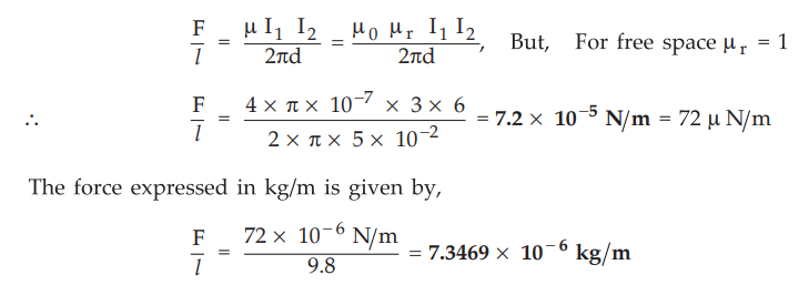 = Distance of separation = 5 cm = 5 × 10-2m, I1 = 3 A, I2 = 6 A, l =