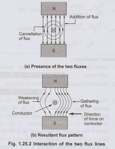 • This interaction as seen is in such a way that on one side of the conductor the two lines help each other, while on other side the two try to cancel each other. This means on left hand side of the conductor shown in the Fig. 1.25.2 the two fluxes are in the same direction and hence assisting each other. As against this, on the right hand side of the conductor the two fluxes are in opposite direction hence trying to cancel each other. Due to such interaction on one side of the conductor, there is accumulation of flux lines (gathering of the flux lines) while on the other side there is weakening of the flux lines. The resultant flux pattern around the conductor is shown in the Fig. 1.25.2 (b).