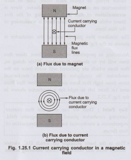 • Now there is presence of two magnetic fields namely due to permanent magnet and due to current carrying conductor. These two fluxes interact with each other. Such interaction is shown in the Fig. 1.25.2 (a).