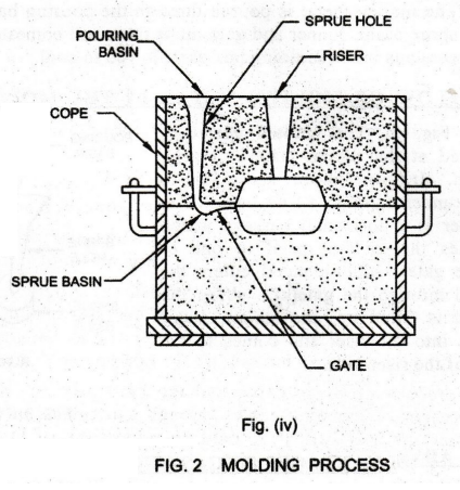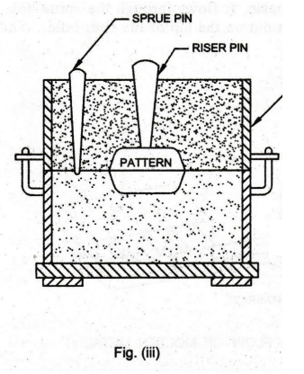 See Fig. (iv). The riser and the sprue pin are removed. A funnel shaped opening