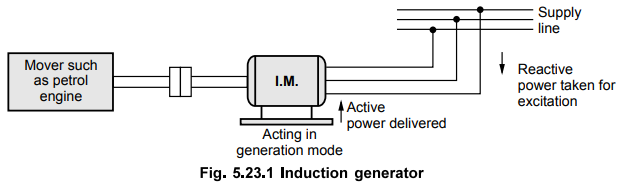 Thus when the slip of the induction motor is negative i.e. when the induction motor runs faster than synchronous speed, the induction motor runs as a generator called induction generator.