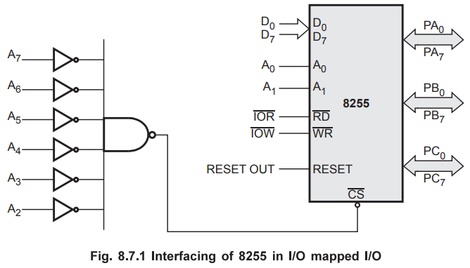8.7.1 shows the interfacing of 8255 with 8085 in I/O mapped I/O technique. Here signals are activated when IO/M signal is high, indicating I/O bus