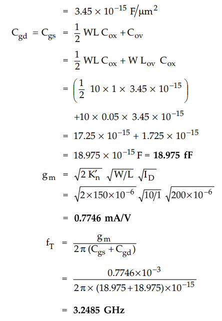 Ex. 7.6.1 For n-channel MOSFET, L = 1.0 µm Lgv = 0.05 µm W=10µm Cox =3.45 × 10-3 F / m2, ID = 200 µA and Kn = 150 µA/ V2. Find the fT if MOSFET is operating in the triode region.