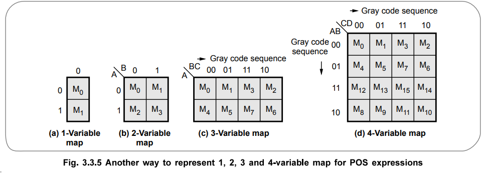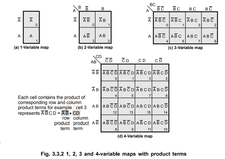 • The Fig. 3.3.3 shows label of the rows and columns of a 1, 2, 3 and 4-variable maps using gray code and the product terms corresponding to each cell. Here, instead of writing actual product terms, corresponding shorthand minterm notations are written in the cell and row and columns are marked with gray code instead of variables.