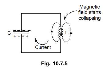 • Now capacitor again starts discharging through inductor L. But the direction of current through circuit is now opposite to the direction of current earlier in the circuit. This is shown in the Fig. 10.7.7. Again electrostatic energy is converted to magnetic energy. When capacitor is fully discharged, the magnetic field starts collapsing, charging the capacitor again in opposite direction.