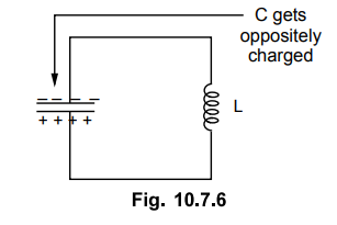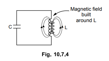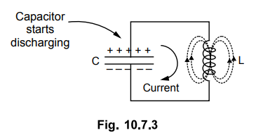 • When the capacitor gets charged, the energy gets stored in a capacitor called electrostatic energy. When such a charged capacitor is connected across inductor L in a tank circuit, the capacitor starts discharging through L, as shown in the Fig. 10.7.3.