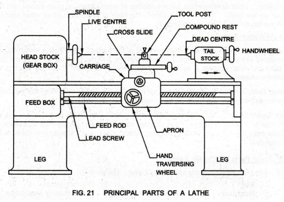 21 shows the principal parts of a Center Lathe. The parts are: