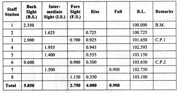 staff held on a Bench Mark of R.L. 100.000 m. Apply arithmetical check.