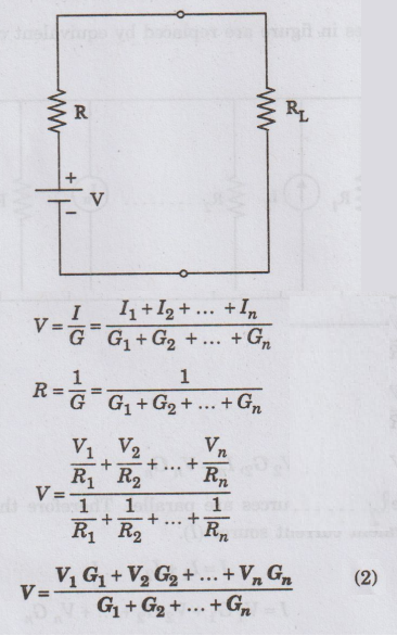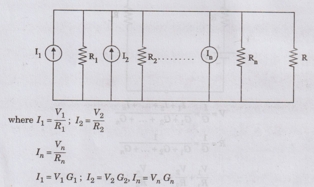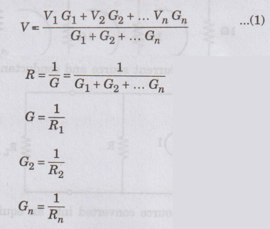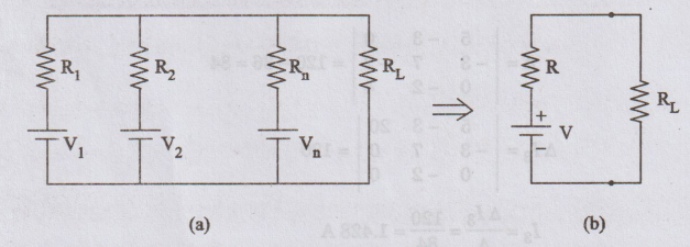 Millman's Theorem states that 'n' voltage sources (V1, V2, ... Vn) are in parallel having their internal resistances (R1, R2, ... Rn) respectively. The arrangement can be replaced by a single voltage source 'V' and resistance 'R' as given below figure (a) (b).