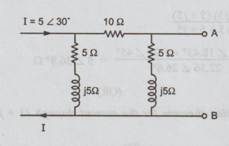 is divided into 2 parallel paths of impedances ( 5+ j5) and 10 + 5+ j5 = 15 + j5.