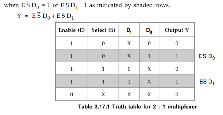 • The Table 3.17.1 shows the truth table for 2 : 1 multiplexer. From the truth table it is clear that Y = 1