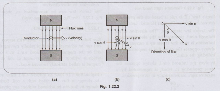 • But if conductor is moving with a velocity v but at a certain angle O measured with respect to direction of the field (plane of the flux) as shown in the Fig. 1.22.2 (b) then component of velocity which is v sin 0 is perpendicular to the direction of flux and hence responsible for the induced e.m.f. The other component v cos O is parallel to the plane of the flux and hence will not contribute to the dynamically induced e.m.f.