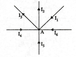 In figure, A is a junction (or node) formed by six conductors. The currents in these conductors are 11, 12, ... I6. Some of these currents are flowing towards A and others flowing away from it.