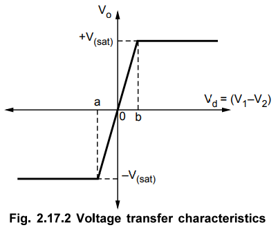 It can be seen from the Fig. 2.17.2, only for small range of input signal (from point a to b), it behaves linearity. This range is very small and practically due to high open loop gain, op-amp either shows + Vsat or - Vsat level.