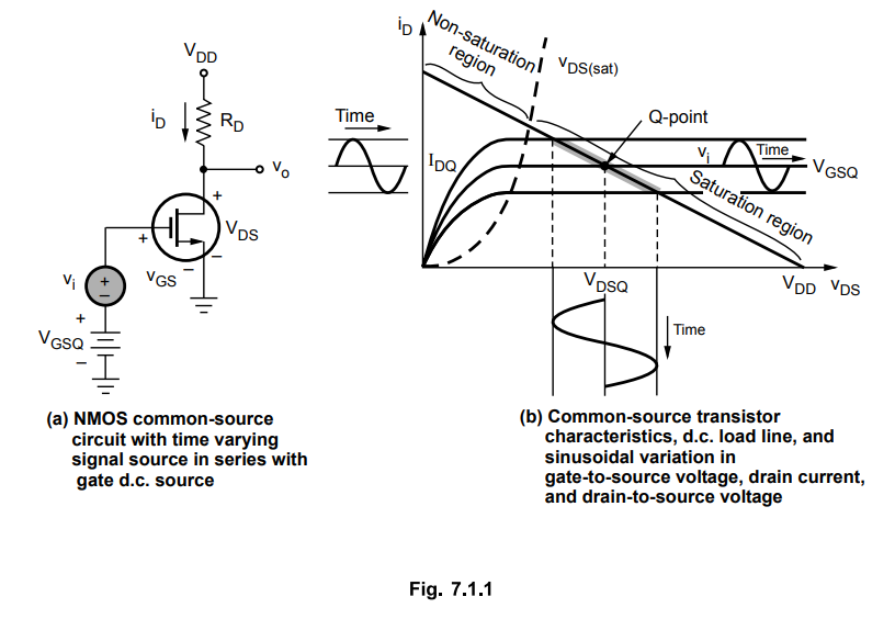 • Fig. 7.1.1 shows n-channel, enhancement mode MOSFET common-source circuit with a time-varying (a.c.) voltage source in series with the d.c. source. We assume the time-varying input signal is sinusoidal.