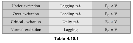 At start, consider normal behaviour of the synchronous motor, where excitation is adjusted to get Eb = V i.e. induced e.m.f. is equal to applied voltage. Such an excitation is called Normal Excitation of the motor.
