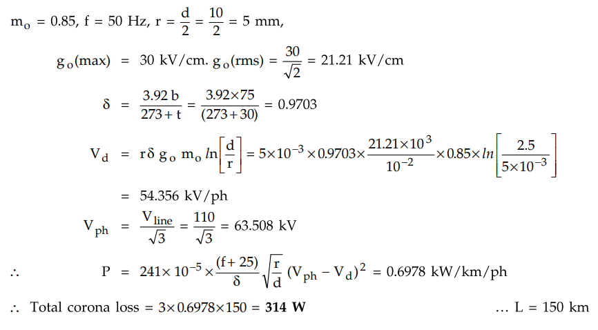 the corona loss for a three-phase, 110 kV, 50 Hz, 150 km long transmission line