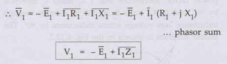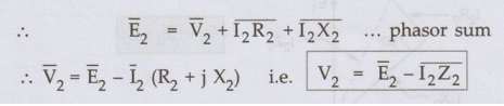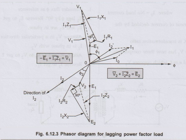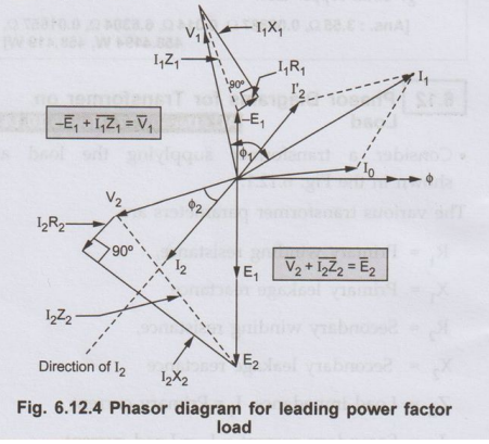 Angle between V1 and I1 is ϕ1 and cos ϕ1 is primary power factor. Remember that I1X1, leads I1 direction by 90° and I2 X2 leads I2 by 90° as current through inductance lags voltage across inductance by 90°. The phasor diagram is shown in the Fig. 6.12.2.
