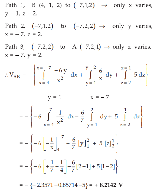 Ex. 4.5.9 If the point B is at (- 2, 3, 3) in the above example, obtain the potential difference between the points A and B.