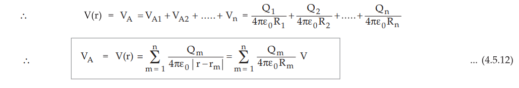• As the potential is scalar, the net potential at point A is the algebraic sum of the potentials at A due to individual point charges, considered one at a time.