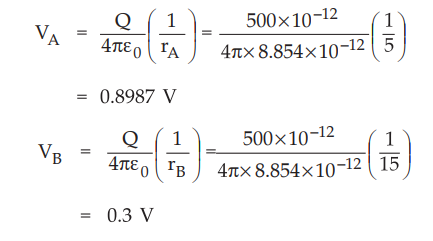 Ex. 4.5.13 Find the potential at rA = 5 m and r B = 15 m due to point charge Q = 500 pC placed at the origin. Find the potential at rA = 5 m assuming zero as potential at infinity. Also obtain the potential difference between points A and B.
