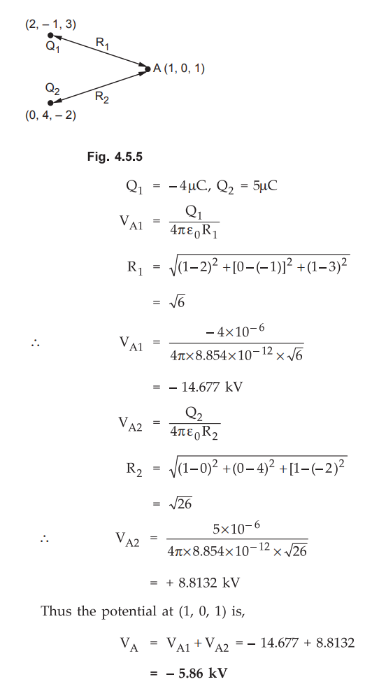 Ex. 4.5.6 Two point charges - 4 µC and 5 ,µC are located at (2, -1, 3) and (0, 4, -2) respectively. Find the potential at (1, 0, 1) assuming zero potential at infinity.