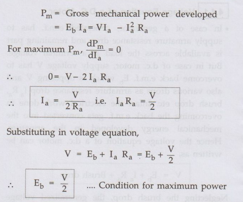 condition for maximum power for a d.c. motor.