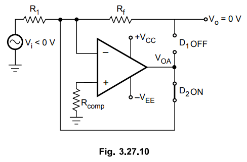 OFF; Vo = 0 V while diode D2 prevents op-amp to go into