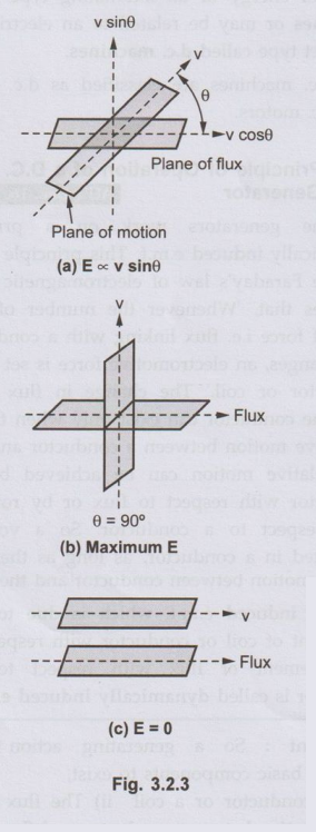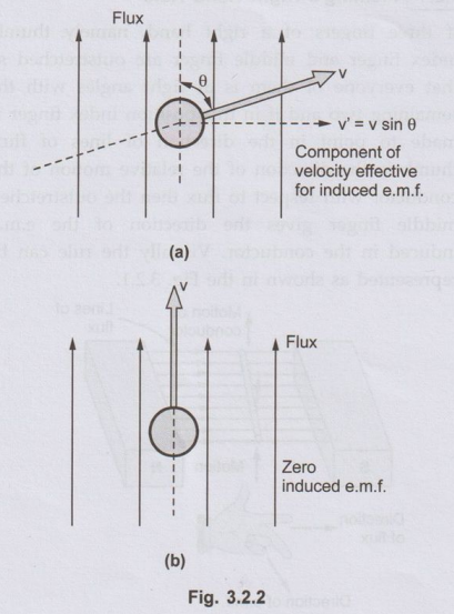 • If the plane of the rotation oof conductor is parallel to the plane of the flux, there will not be any cutting of flux and hence there cannot be any induced e.m.f. in the conductor. This is shown in the Fig. 3.2.2(b)