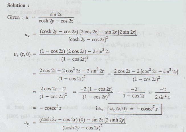 Example 3.3.6. (a) Determine the analytic function whose real part is sin 2x/ cosh 2y - cos 2x [Anna, May 1996] [A.U Tvli. A/M 2009] [A.U N/D 2012] [A.U N/D 2014] [A.U A/M 2015 R8] [A.U A/M 2019 R17]