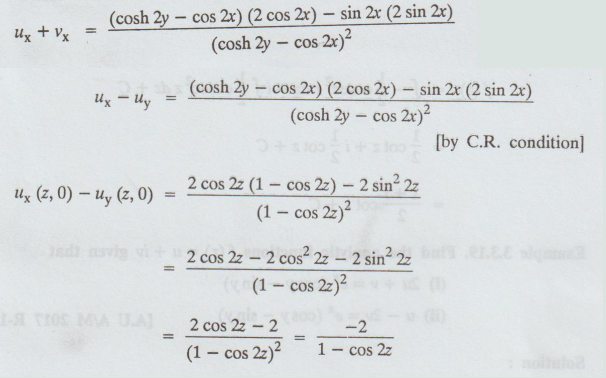 Example 3.3.18. Find the analytic function for which sin 2x / cosh 2y - cos 2x is the real part. Hence determine the analytic function u + iv for which u + v is the above function. [A.U A/M 2019 (R17)] [Anna, May 2000, Anna, May 2001]