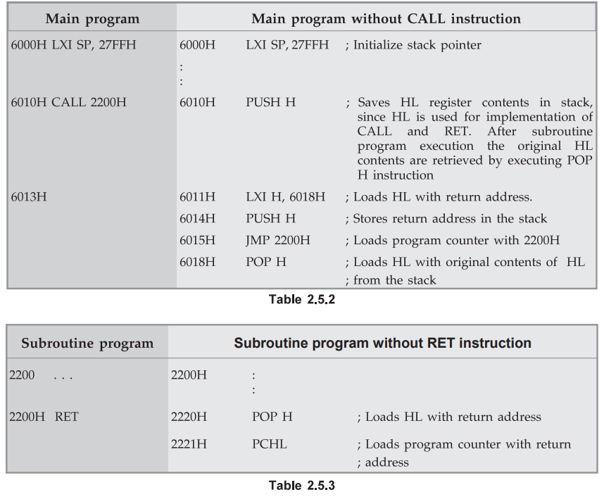 The table shows how we can 'Call' and 'Return' from the subroutine without