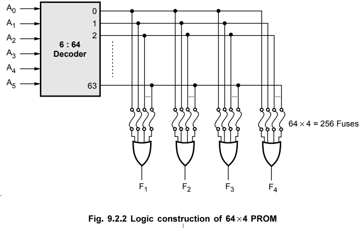 The Fig. 9.2.2 shows the internal logic construction of a 64 × 4 PROM. The six