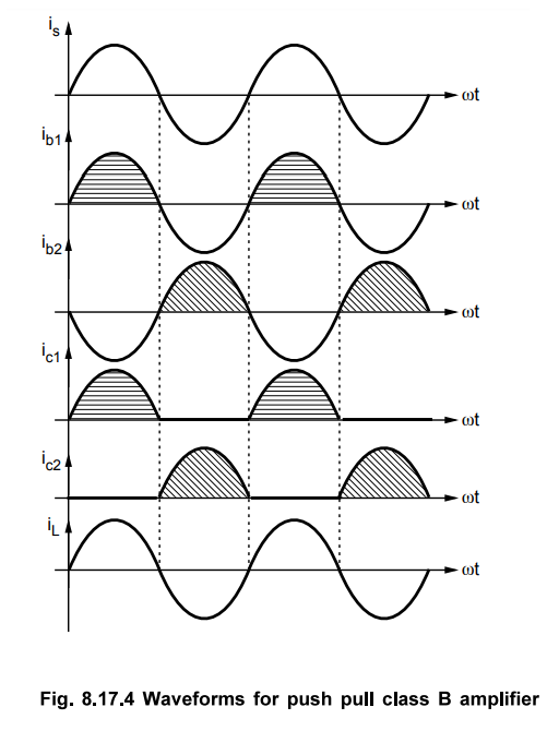 • Both the transformers are centre tapped transformers. The push pull class B amplifier circuit is shown in the Fig. 8.17.1.
