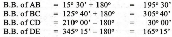 BC, 150° 15'; CD, 270° 20'; and DE, 3250 30'. Find their back bearings.