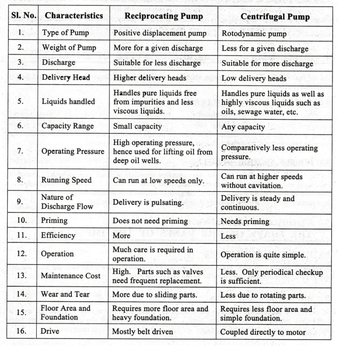 Comparison of the characteristics of reciprocating pump and centrifugal pump is given below: