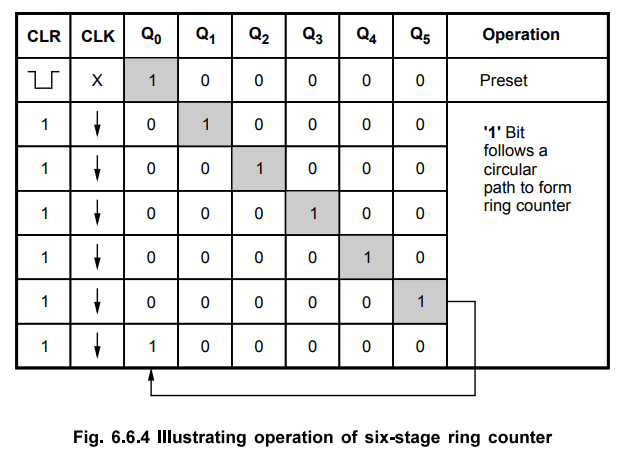 The Fig. 6.6.4 shows the operation of six-stage ring counter. On preset, FFO